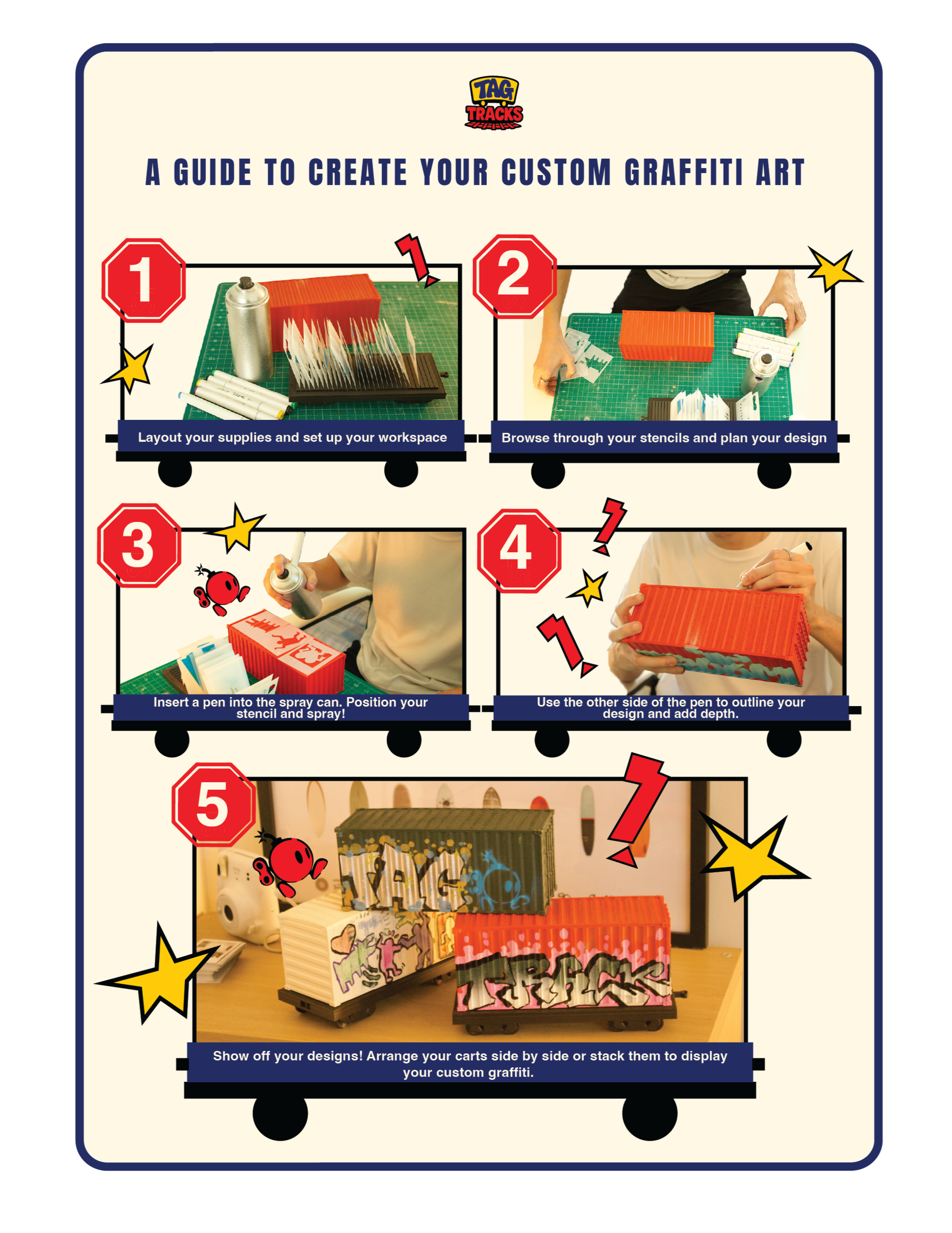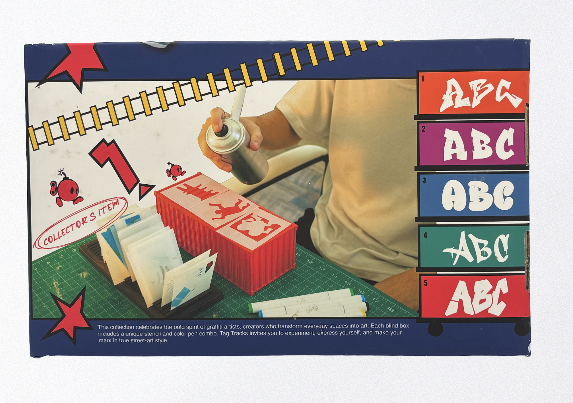 A mini container and train bed diorama, with unique graffiti inspired alphabet stencils, and markers + blow pen spray can bundle.